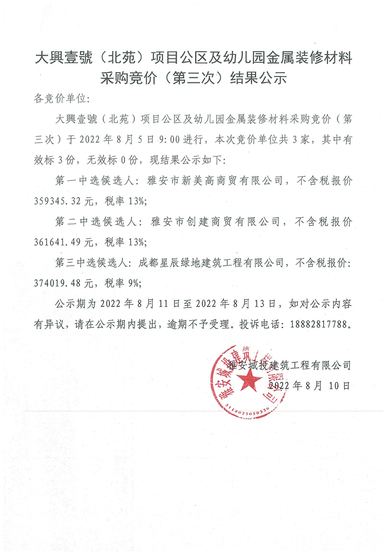 大興壹號(北苑)項目公區(qū)及幼兒園金屬裝修材料競價(第三次)結(jié)果公示