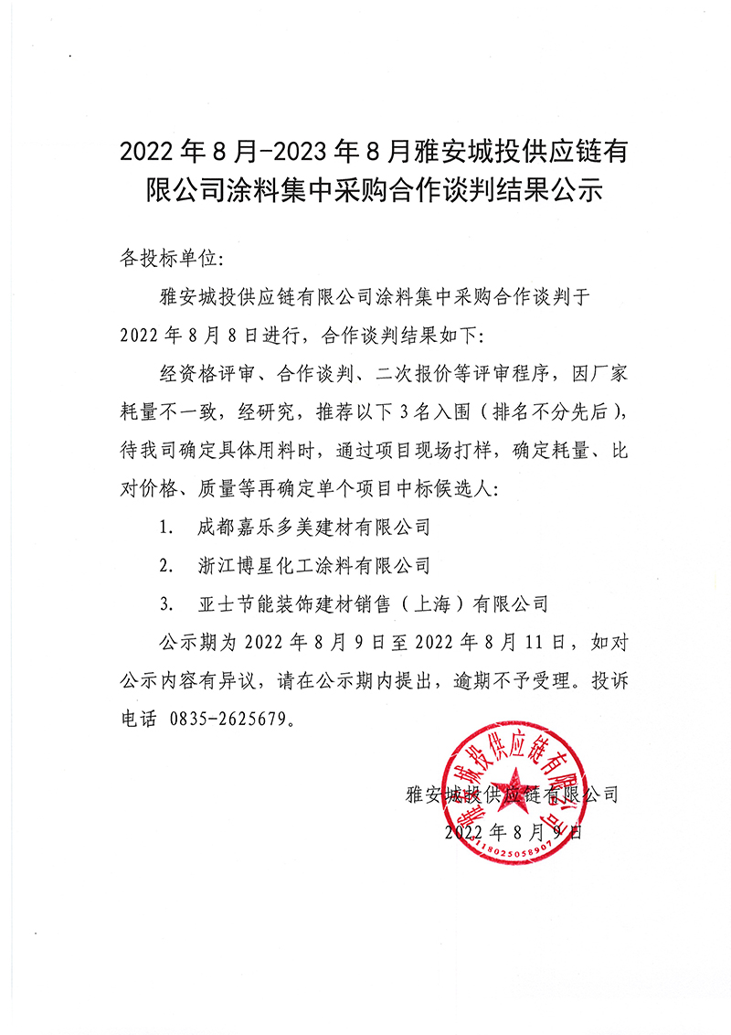 2022年8月-2023年8月雅安城投供應(yīng)鏈有限公司涂料談判結(jié)果公示