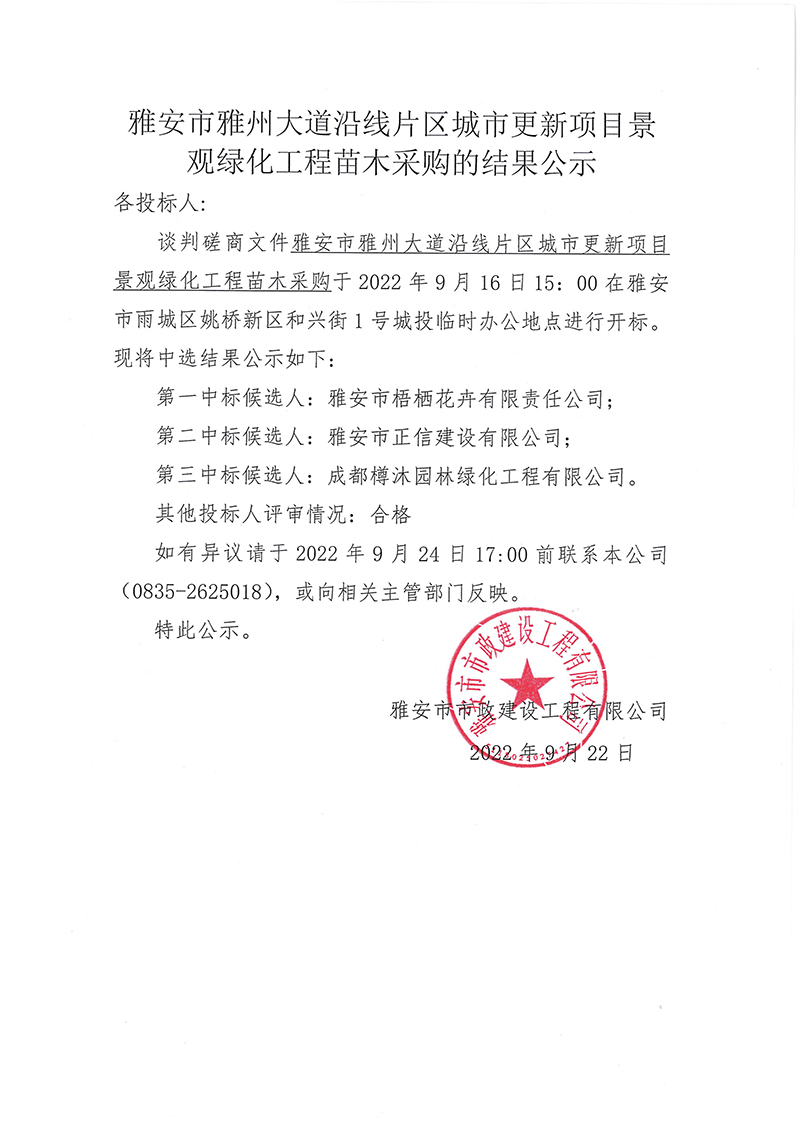 雅安市雅州大道沿線片區(qū)城市更新項(xiàng)目景觀綠化工程苗木采購的結(jié)果公示