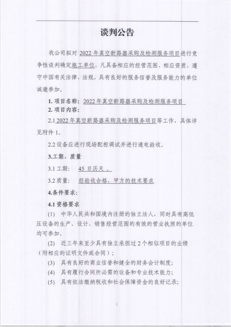 城利水電公司2022年真空斷路器采購及檢測服務項目競爭性談判公告