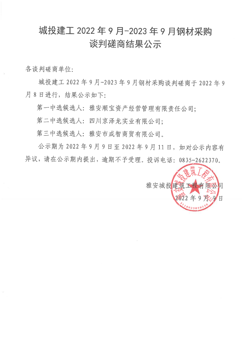 城投建工2022年9月-2023年9月鋼材采購談判磋商結(jié)果公示
