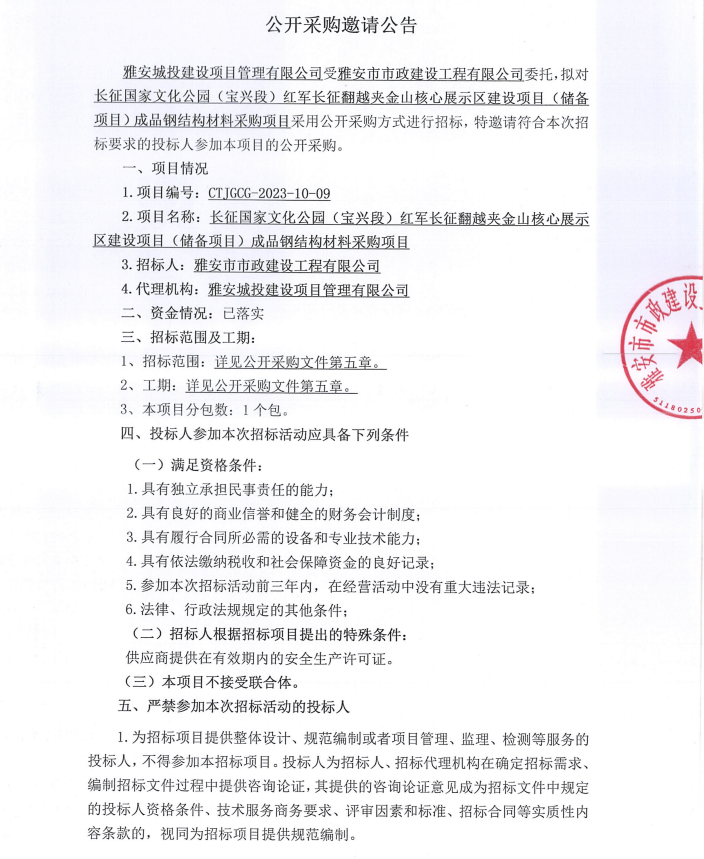 長(zhǎng)征國(guó)家文化公園(寶興段)紅軍長(zhǎng)征翻越夾金山核心展示區(qū)建設(shè)項(xiàng)目(儲(chǔ)備項(xiàng)目)成品鋼結(jié)構(gòu)材料采購(gòu)項(xiàng)目公開(kāi)采購(gòu)邀請(qǐng)公告
