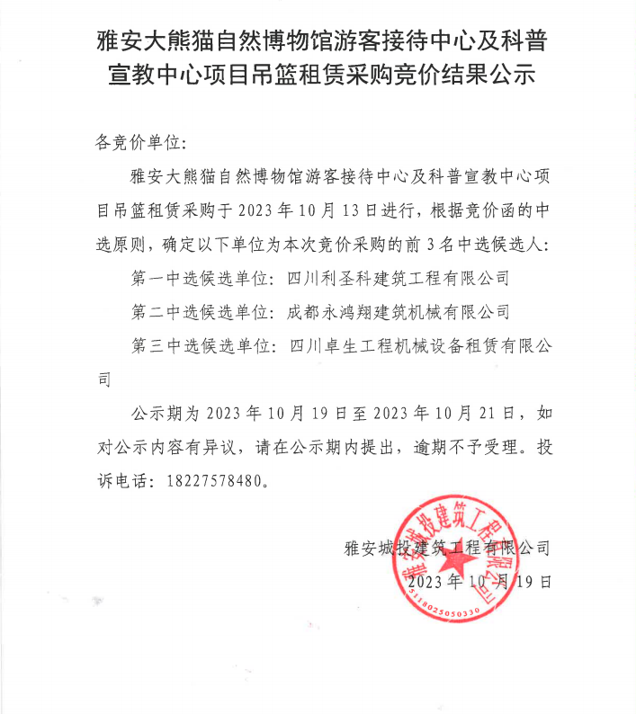 雅安大熊貓自然博物館游客接待中心及科普宣教中心項(xiàng)目吊籃租賃采購競價結(jié)果公示