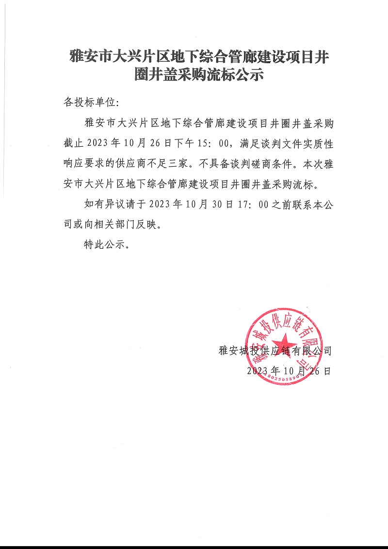 雅安市大興片區(qū)地下綜合管廊建設(shè)項(xiàng)目井圈井蓋采購流標(biāo)公示