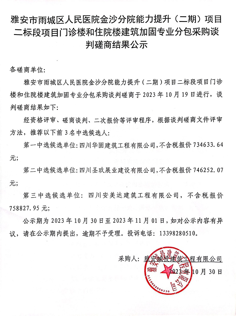 雅安市雨城區(qū)人民醫(yī)院金沙分院能力提升(二期)項目二標(biāo)段門診樓和住院樓建筑加固專業(yè)分包采購談判磋商結(jié)果公示