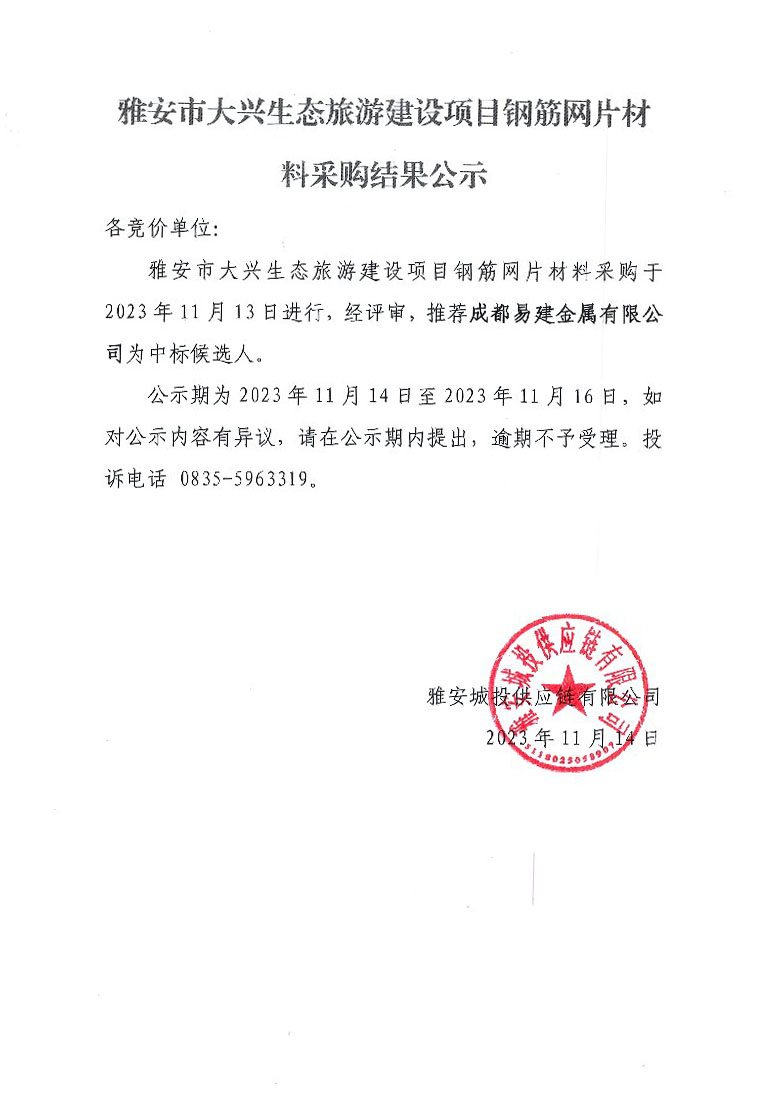 雅安市大興生態(tài)旅游建設項目鋼筋網(wǎng)片材料采購結(jié)果公示
