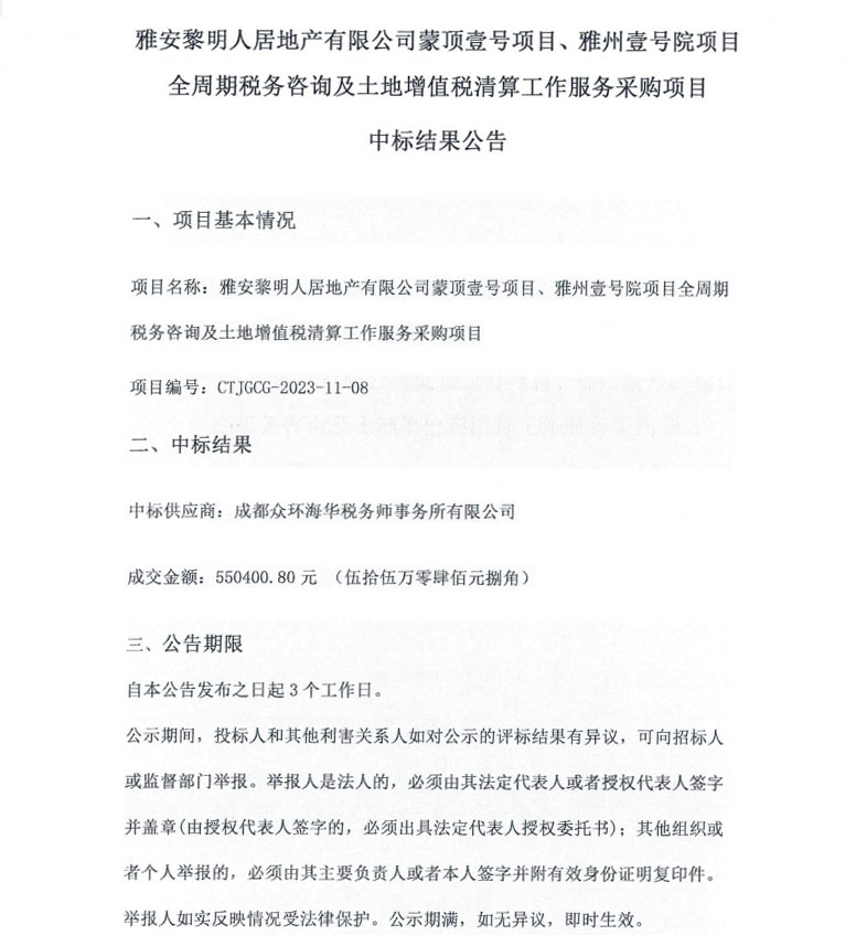 雅安黎明人居地產(chǎn)有限公司蒙頂壹號(hào)項(xiàng)目、雅州壹號(hào)院項(xiàng)目全周期稅務(wù)咨詢(xún)及土地增值稅清算工作服務(wù)采購(gòu)項(xiàng)目中標(biāo)結(jié)果公告