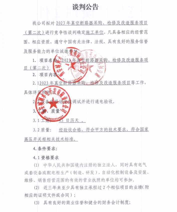 2023年真空斷路器采購、檢修及改造服務(wù)項目(第二次)談判公告