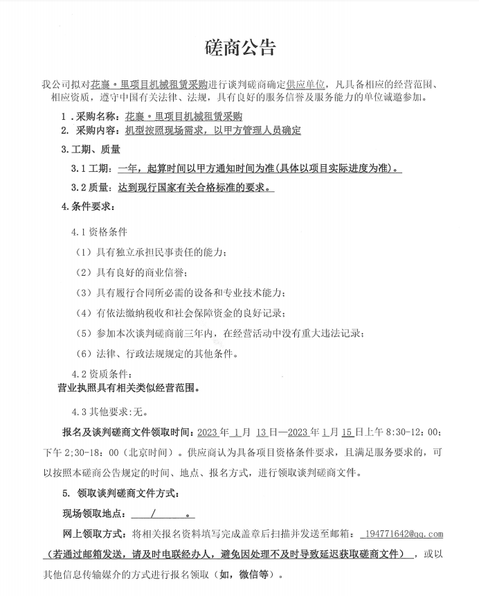 花襄·里項目機械租賃采購談判磋商公告