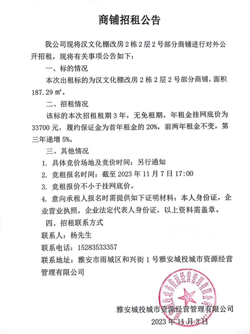 漢文化棚改房2棟2層2號部分商鋪招租公告