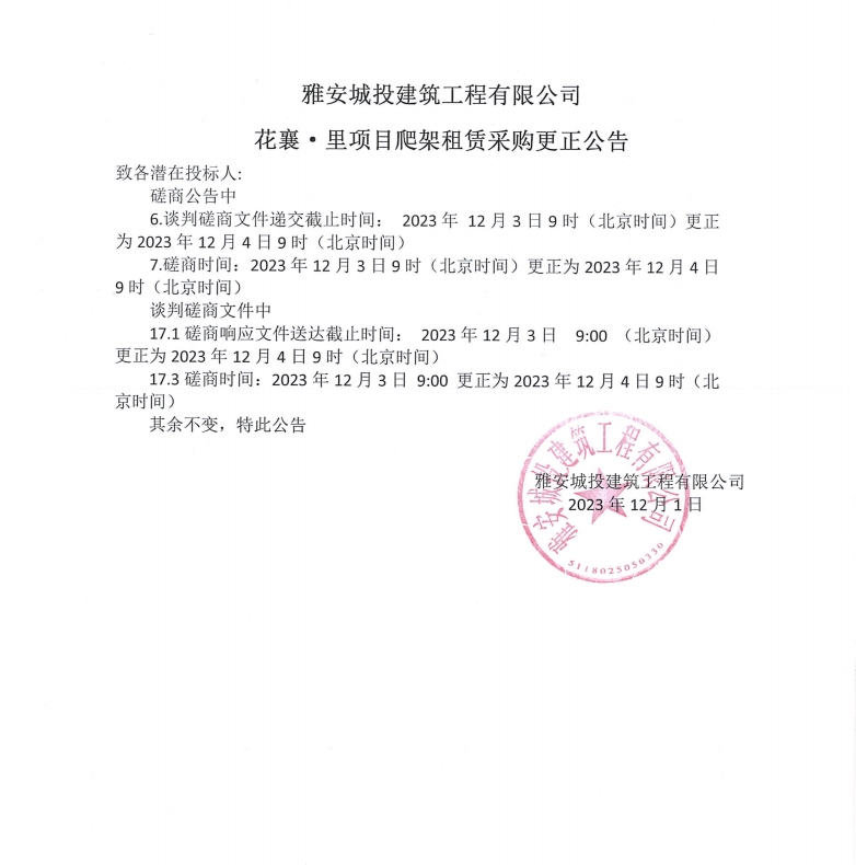 雅安城投建筑工程有限公司花襄·里項目爬架租賃采購更正公告
