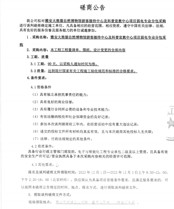 雅安大熊貓自然博物館游客接待中心及科普宣教中心項(xiàng)目弱電專(zhuān)業(yè)分包采購(gòu)談判磋商公告