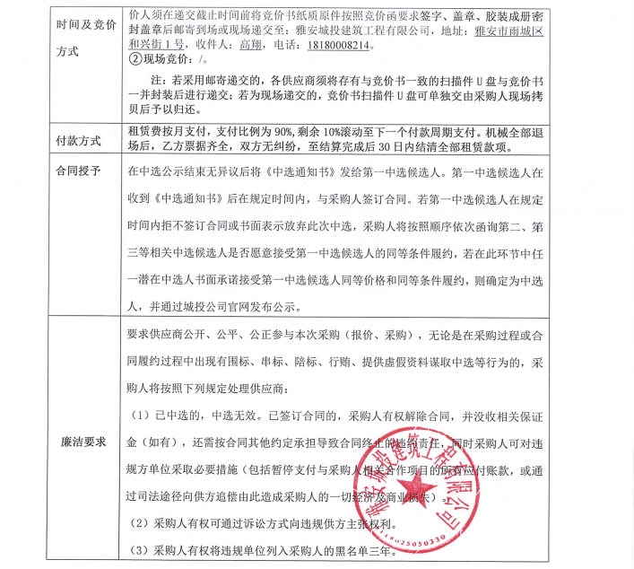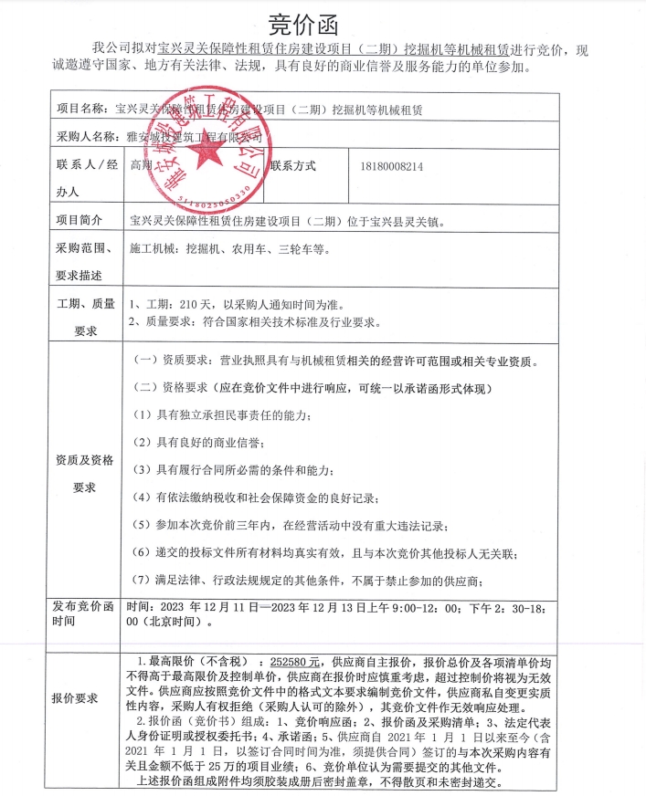 寶興靈關(guān)保障性租賃住房建設(shè)項(xiàng)目(二期)挖掘機(jī)等機(jī)械租賃競價(jià)公告
