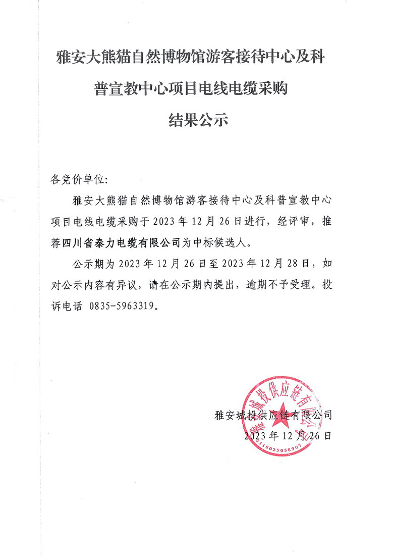 雅安大熊貓自然博物館游客接待中心及科普宣教中心項目電線電纜采購結(jié)果公示