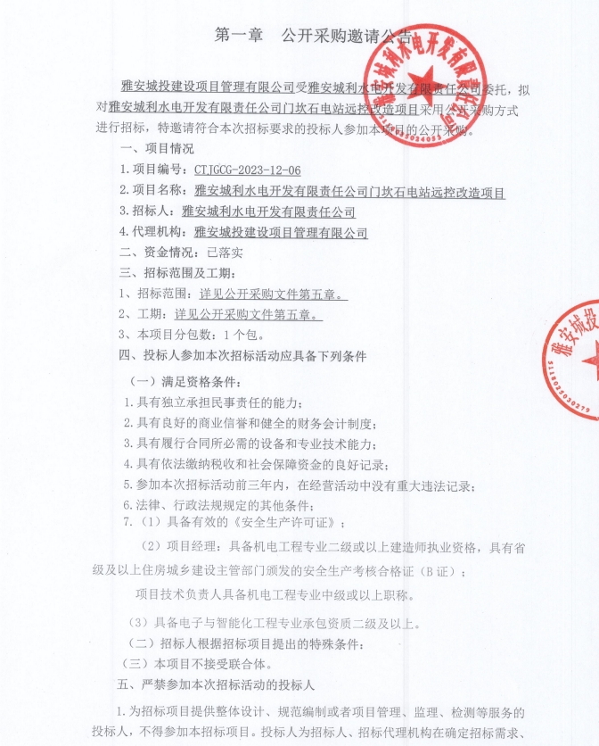 雅安城利水電開發(fā)有限責任公司門坎石電站遠控改造項目公開采購邀請公告