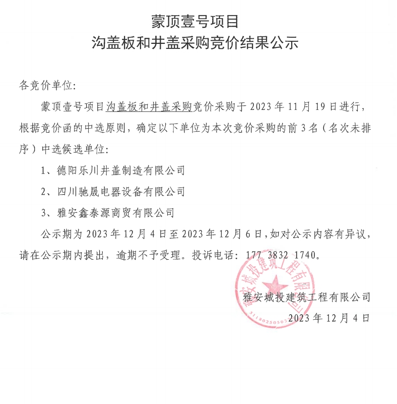 蒙頂壹號項目溝蓋板和井蓋采購競價結(jié)果公示