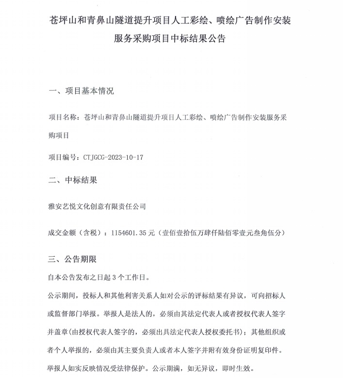 蒼坪山和青鼻山隧道提升項(xiàng)目人工彩繪、噴繪廣告制作安裝服務(wù)采購(gòu)項(xiàng)目中標(biāo)結(jié)果公告