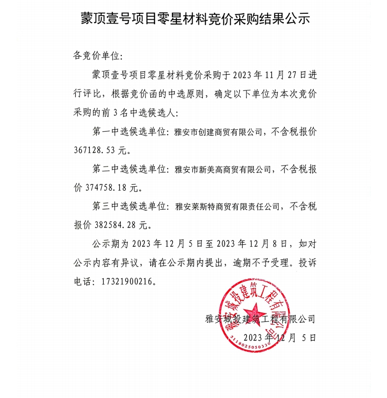 蒙頂壹號項(xiàng)目零星材料競價(jià)采購結(jié)果公示