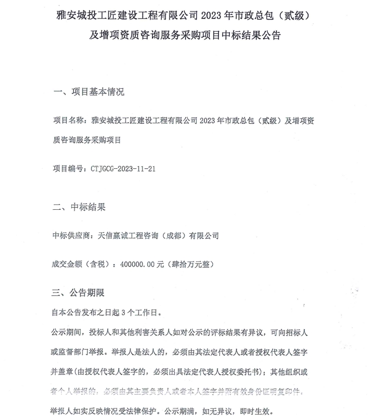 雅安城投工匠建設工程有限公司2023年市政總包(貳級)及增項資質(zhì)咨詢服務采購項目中標結(jié)果公告