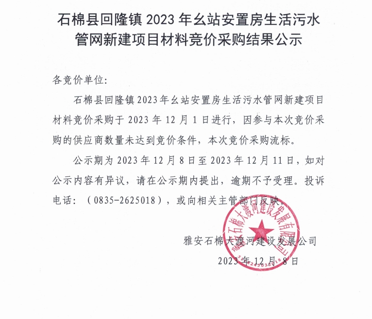 石棉縣回隆鎮(zhèn)2023年幺站安置房生活污水管網(wǎng)新建項(xiàng)目材料競(jìng)價(jià)采購(gòu)結(jié)果公示