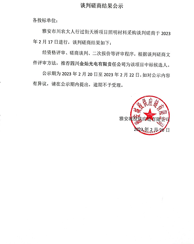 雅安市川農(nóng)大人行過街天橋項(xiàng)目照明材料采購談判磋商結(jié)果公示