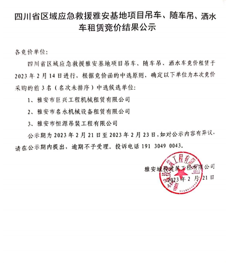 四川省區(qū)域應(yīng)急救援雅安基地項(xiàng)目吊車、隨車吊、灑水車租賃競價(jià)結(jié)果公示