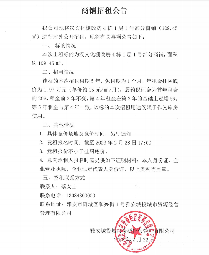 漢文化棚改房4棟1層1號部分商鋪招租公告