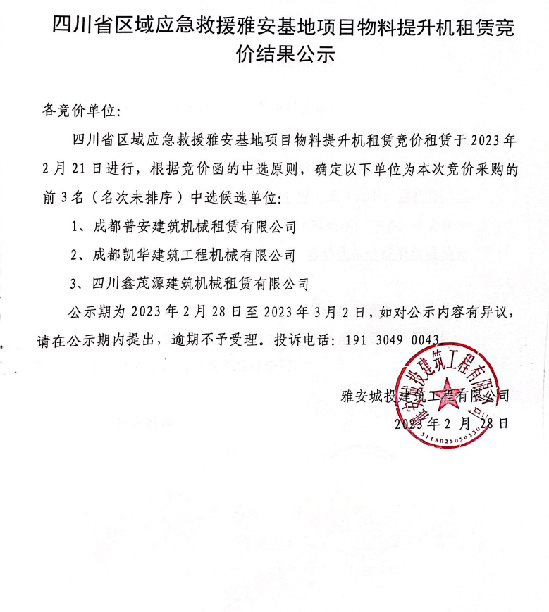四川省區(qū)域應(yīng)急救援雅安基地項(xiàng)目物料提升機(jī)租賃競(jìng)價(jià)結(jié)果公示