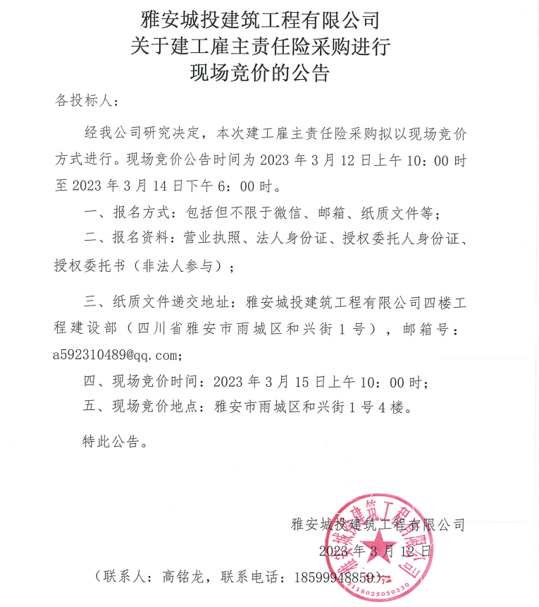 雅安城投建筑工程有限公司關于建工雇主責任險采購進行現(xiàn)場競價的公告