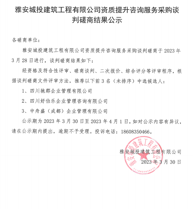 雅安城投建筑工程有限公司資質(zhì)提升咨詢服務(wù)采購(gòu)談判磋商結(jié)果公示