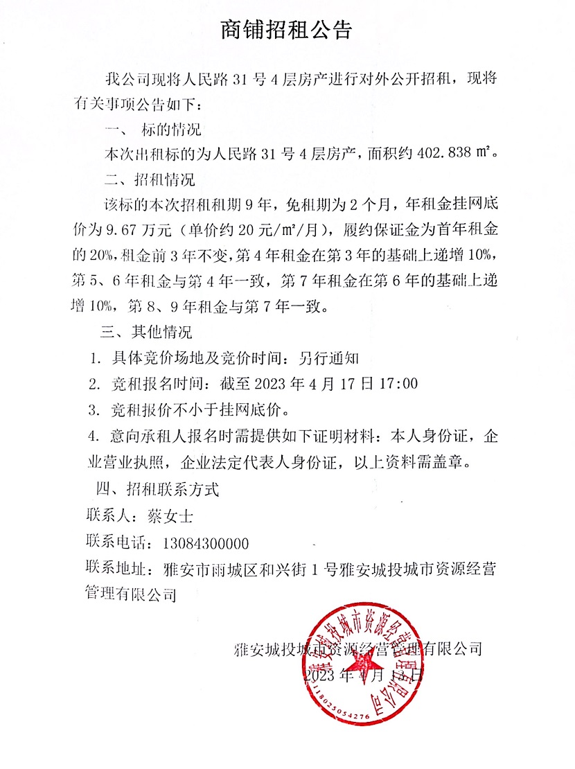 人民路31號(hào)4層房產(chǎn)商鋪招租公告