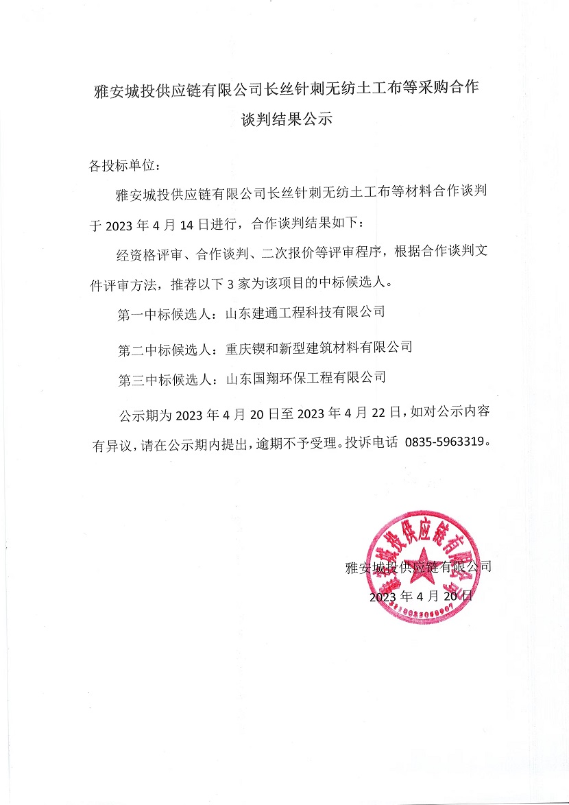 雅安城投供應(yīng)鏈有限公司長(zhǎng)絲針刺無紡?fù)凉げ嫉炔少徍献髡勁薪Y(jié)果公示