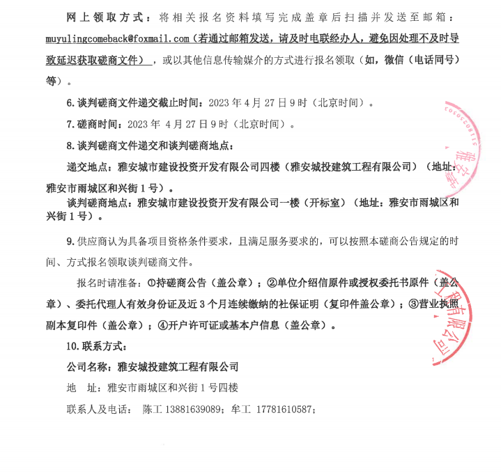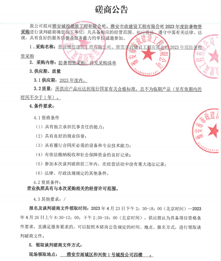 雅安城投建筑工程有限公司、雅安市政建設工程有限公司2023年度防暑物資采購談判磋商公告