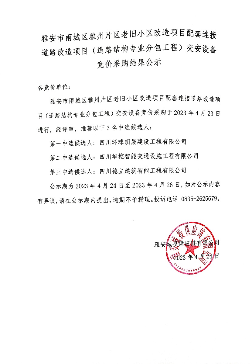 雅安市雨城區(qū)雅州片區(qū)老舊小區(qū)改造項(xiàng)目配套連接道路改造項(xiàng)目(道路結(jié)構(gòu)專業(yè)分包工程)交安設(shè)備競價(jià)采購結(jié)果公示