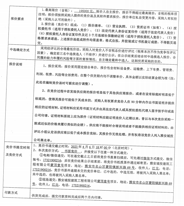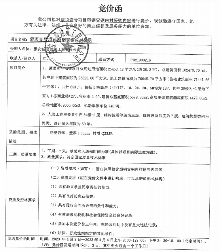 蒙頂壹號項(xiàng)目塑鋼窗鋼內(nèi)襯采購內(nèi)容競價公告
