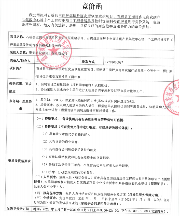 王崗坪集鎮(zhèn)項(xiàng)目、王崗坪集散中心打捆項(xiàng)目工程量清單及控制價(jià)編制咨詢服務(wù)采購競(jìng)價(jià)公告