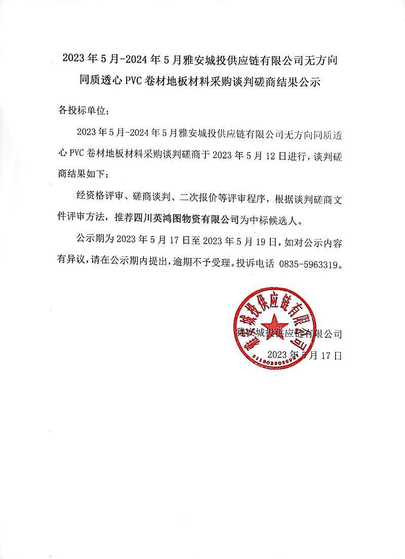 2023年5月-2024年5月雅安城投供應鏈有限公司無方向同質透心PVC卷材地板材料采購談判磋商結果公示