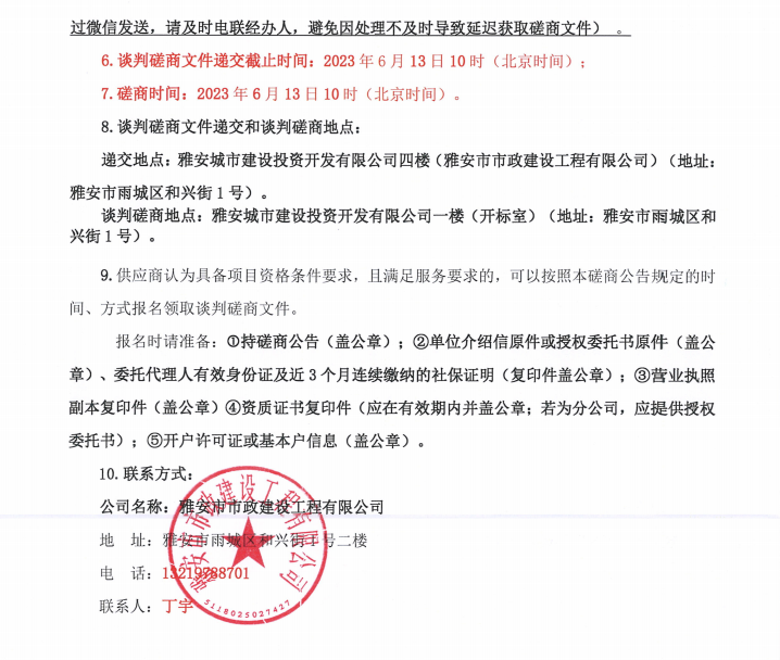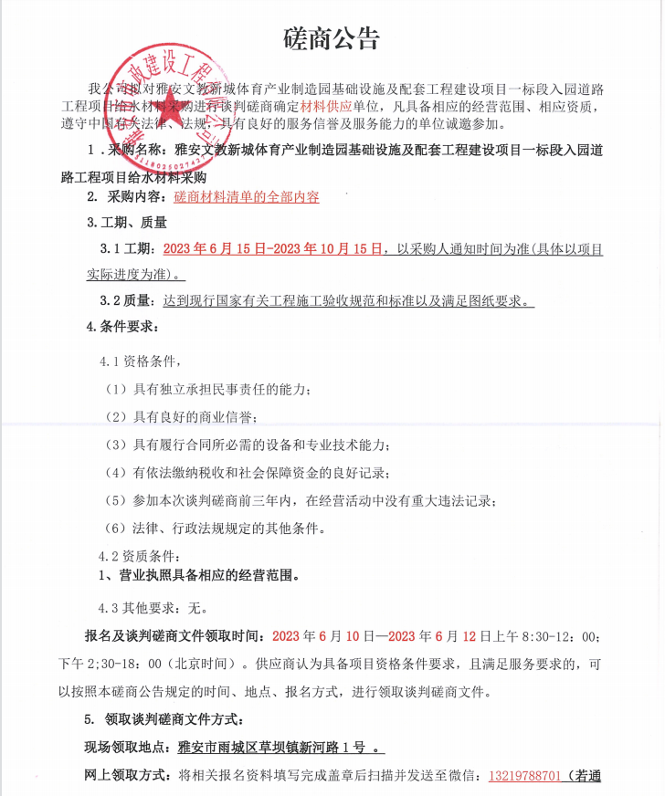 雅安文教新城體育產(chǎn)業(yè)制造園基礎設施及配套工程建設項目一標段入園道路工程項目給水材料采購談判磋商公告