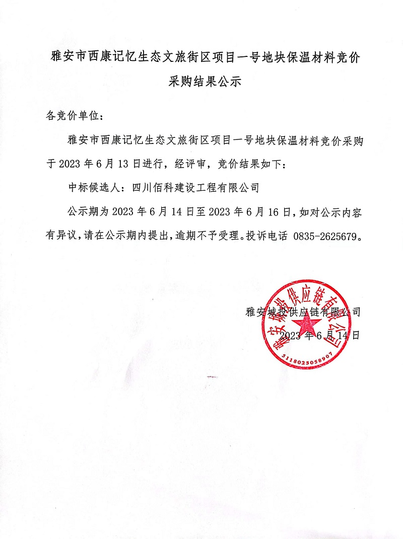 雅安市西康記憶生態(tài)文旅街區(qū)項目一號地塊保溫材料采購競價采購結(jié)果公示