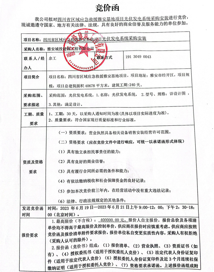 四川省區(qū)域應(yīng)急救援雅安基地項(xiàng)目光伏發(fā)電系統(tǒng)采購安裝競價(jià)公告