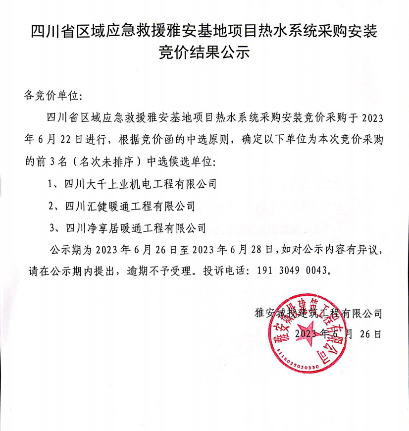 四川省區(qū)域應急救援雅安基地項目熱水系統(tǒng)采購安裝競價結(jié)果公示