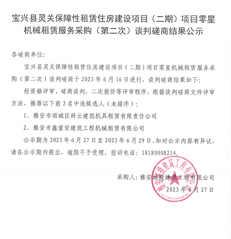 寶興縣靈關(guān)保障性租賃住房建設(shè)項目(二期)項目零星機械租賃服務(wù)采購(二次)談判磋商結(jié)果公示