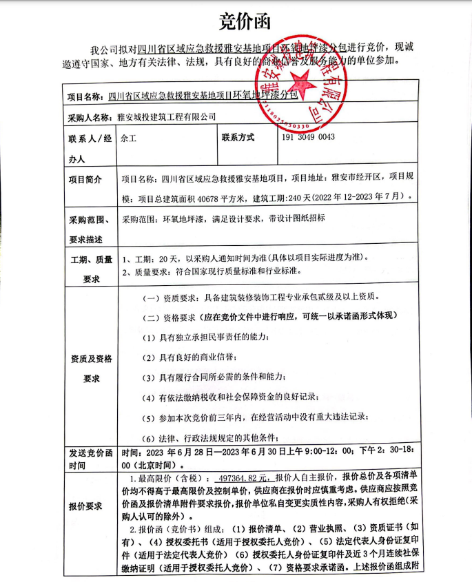四川省區(qū)域應(yīng)急救援雅安基地項目環(huán)氧地坪漆分包競價公告