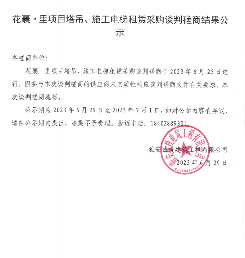 花襄·里項(xiàng)目塔吊、施工電梯租賃采購談判磋商結(jié)果公示