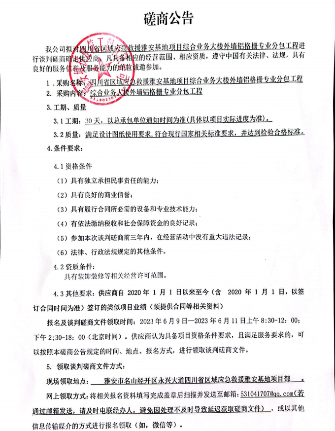 四川省區(qū)域應(yīng)急救援雅安基地項(xiàng)目綜合業(yè)務(wù)大樓外墻鋁格柵專(zhuān)業(yè)分包工程談判磋商公告