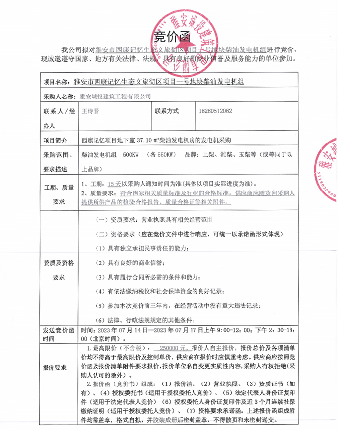 雅安市西康記憶生態(tài)文旅街區(qū)項(xiàng)目一號(hào)地塊柴油發(fā)電機(jī)組競(jìng)價(jià)采購(gòu)公告