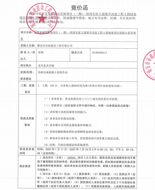 寶興縣城市更新項目(一期)-濱河長征大道提升改造工程A段儲備項目混凝土泵車租賃競價公告