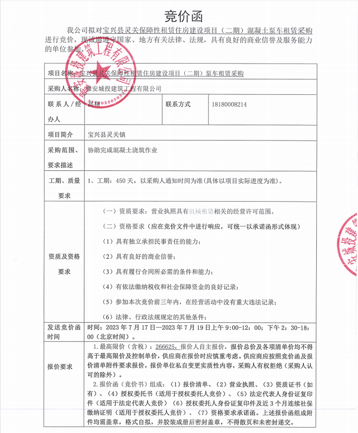 寶興縣靈關保障性租賃住房建設項目(二期)混凝土泵車租賃采購競價公告