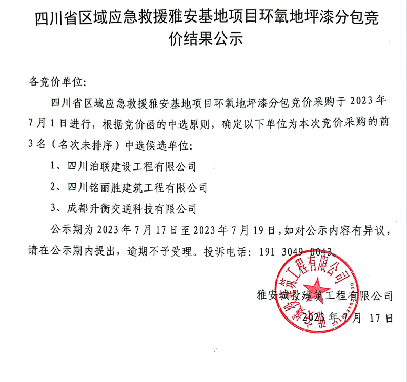 四川省區(qū)域應急救援雅安基地項目環(huán)氧地坪漆分包競價結(jié)果公示