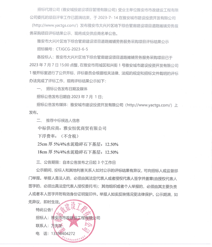 雅安市大興片區(qū)地下綜合管廊建設(shè)項目道路攤鋪勞務(wù)服務(wù)采購項目評標結(jié)果公示